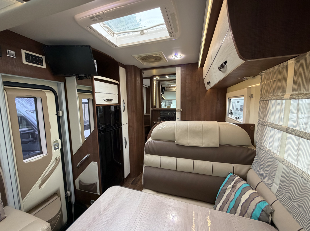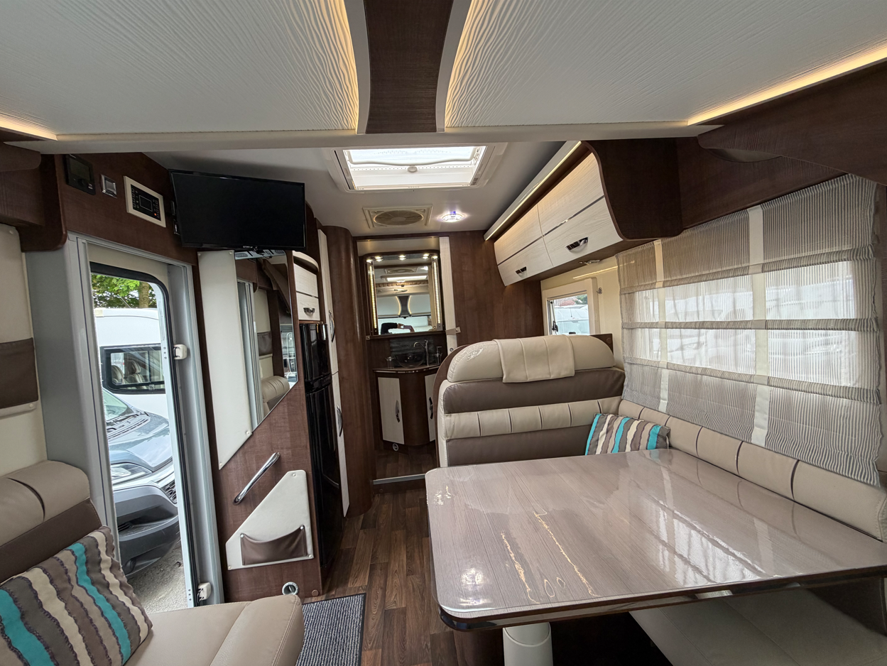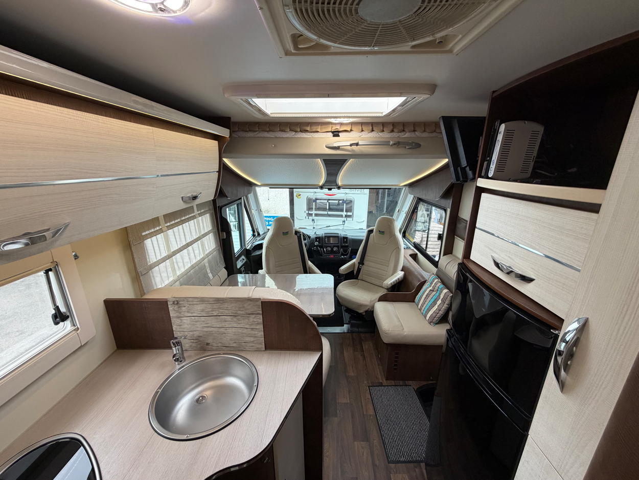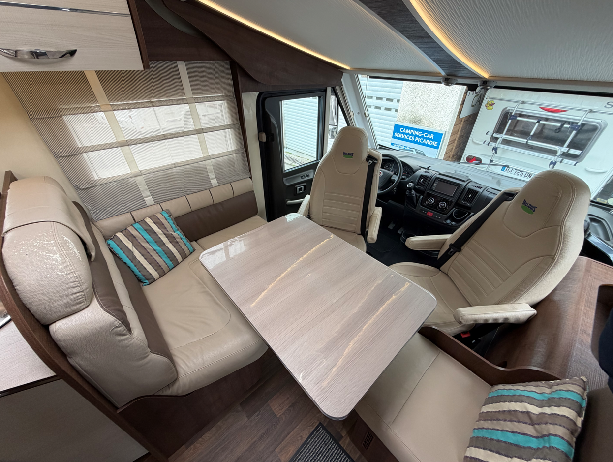 Camping Car Intégral avec lit central + Lit pavillon + Lit dinette, Dinette modulable 5 places, Grande Salle de bain centrale avec grande douche et WC à cassette, Chauffe eau + chauffage combi TRUMA 6 gaz et 220v , Nombreux rangements, Evier, Cuisine avec feux 3 gaz, Ouvrants avec moustiquaires + stores, Grand frigo avec freezeur, Store extérieur, Panneau solaire, Antenne satellite automatique avec TV, Attelage, Renforts de suspensions av+ar Sumosprings , Station multimédia avec Caméra de recul, Duo control gaz, Turbo vent, 2 Batteries cellule…