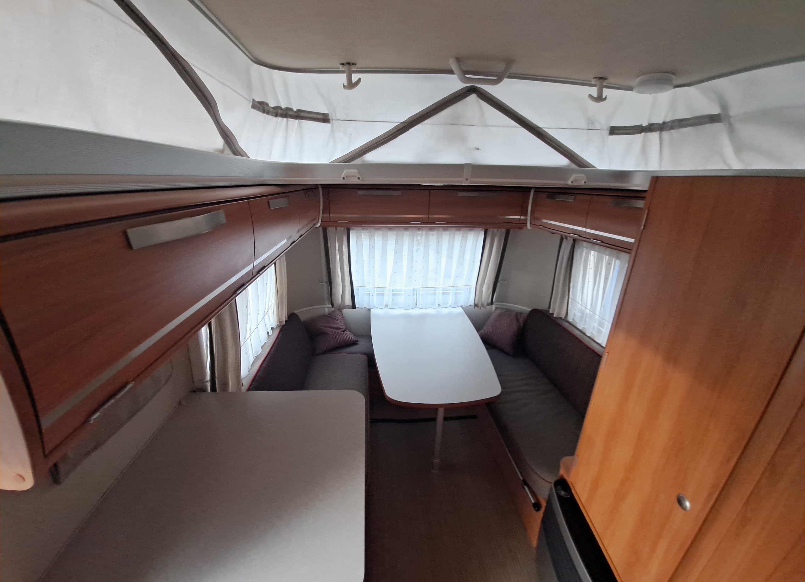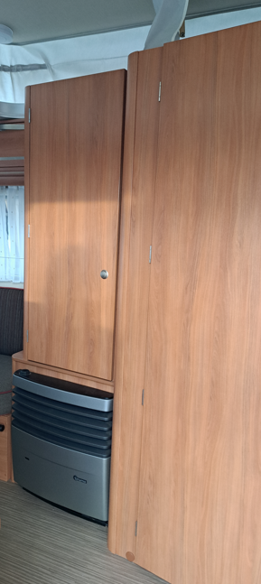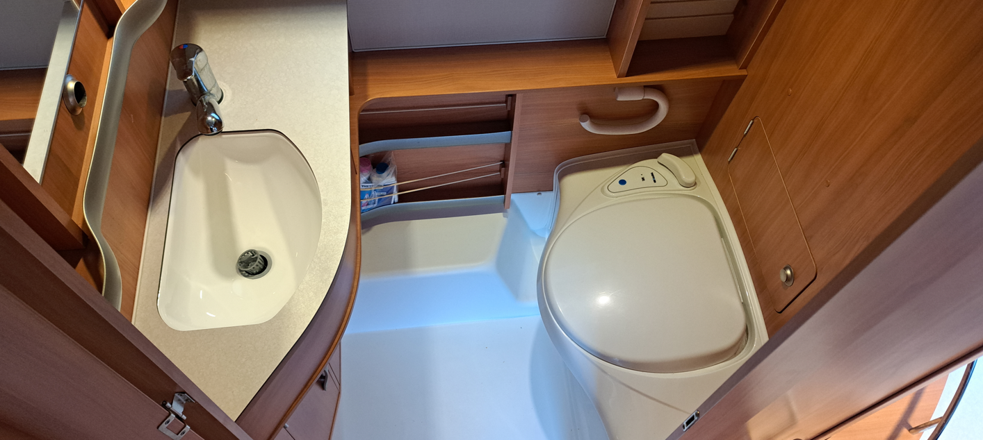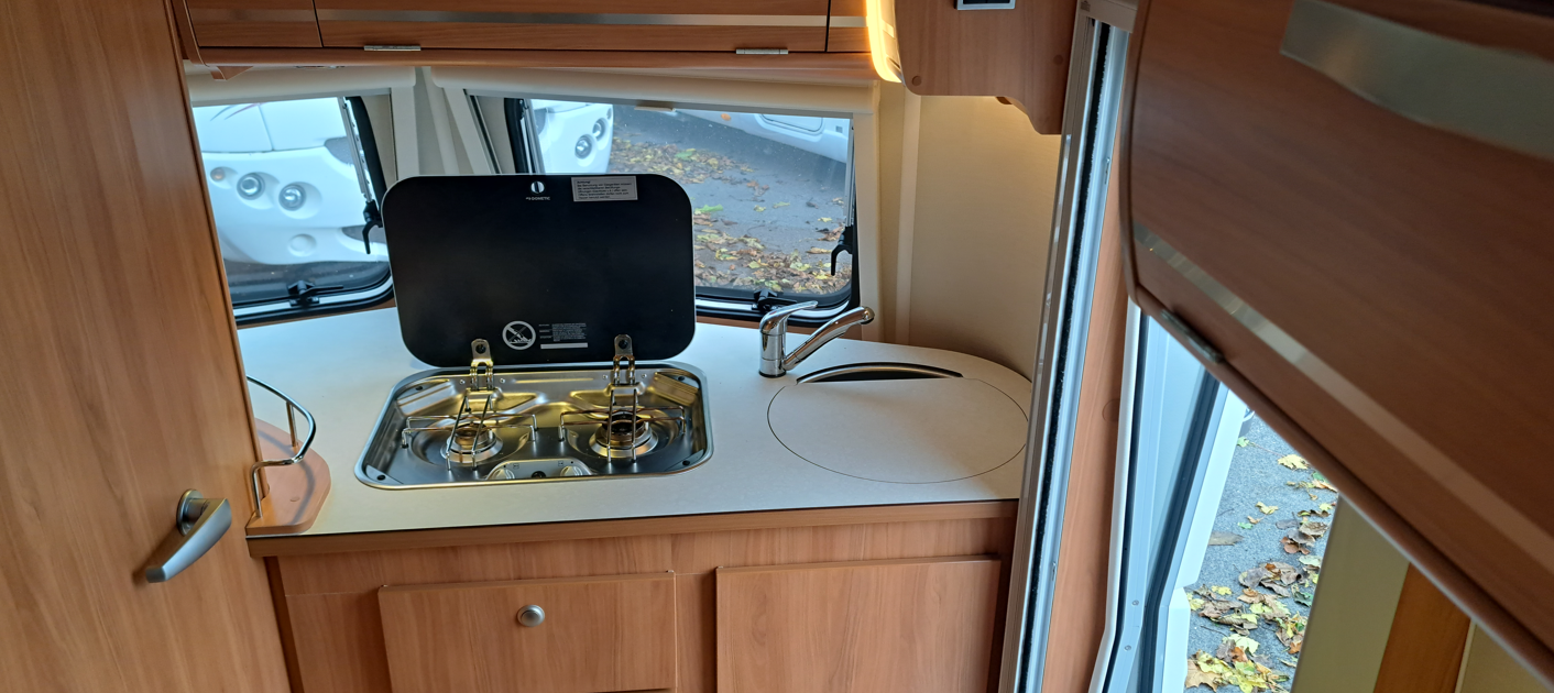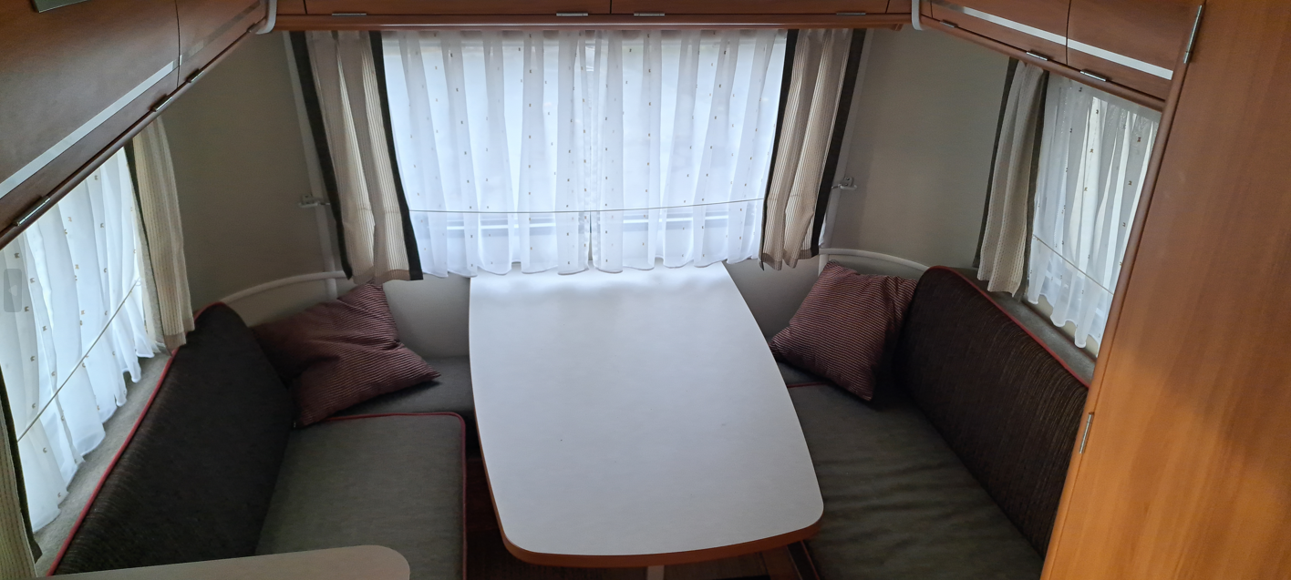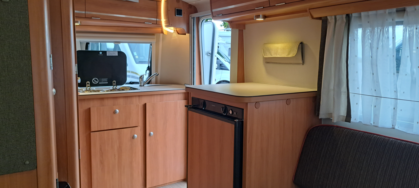 Une dînette pour quatre personnes transformable en lit, un bloc cuisine, un frigo trimixte, une salle de bain avec lavabo, un WC à cassette et un chauffage Truma gaz.