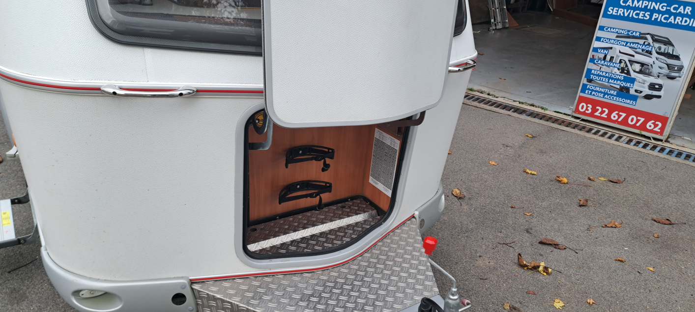 Caractéristique de toutes les ERIBA, son « champignon » qui se relève équipé d’ouvertures avec moustiquaires pour l’aération. Toutes les baies sont équipées de stores et moustiquaires. La bouteille de gaz se loge dans un compartiment intégré à la carrosserie.