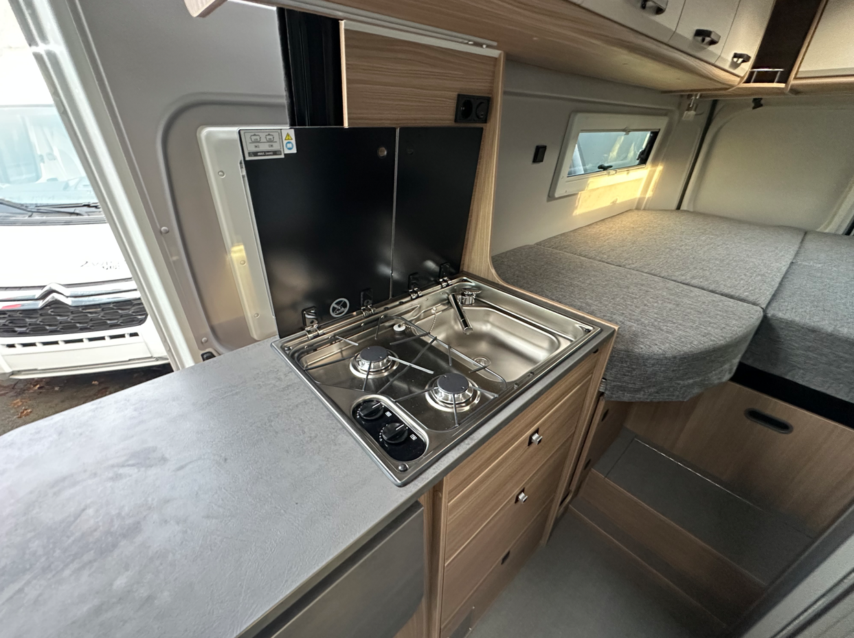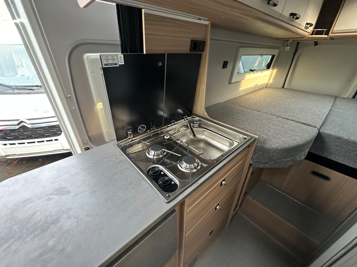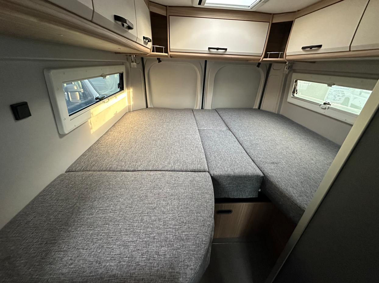 Les lits jumeaux généreux sont son point fort. Cette configuration permet d’acceder facilement dans chacun des 2 lits sans déranger l’autre tout en conservant la maniabilité et la facilité de stationnement d’un fourgon de 6 métres !