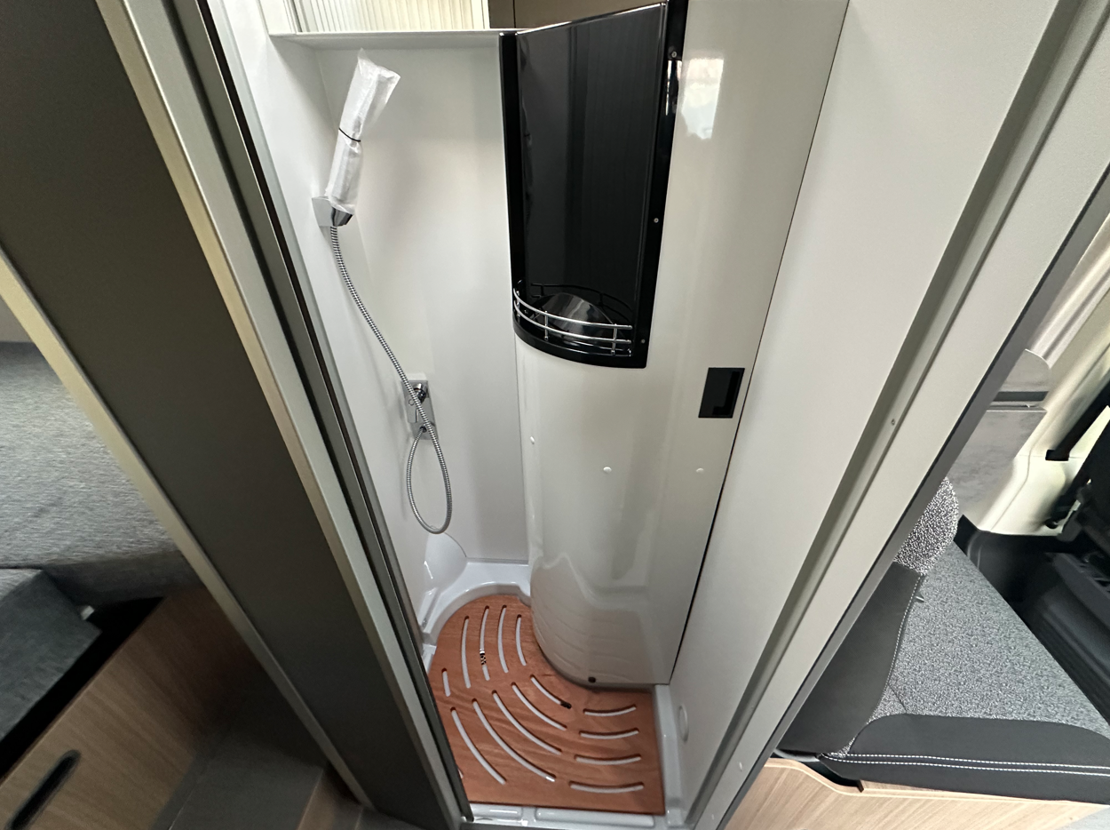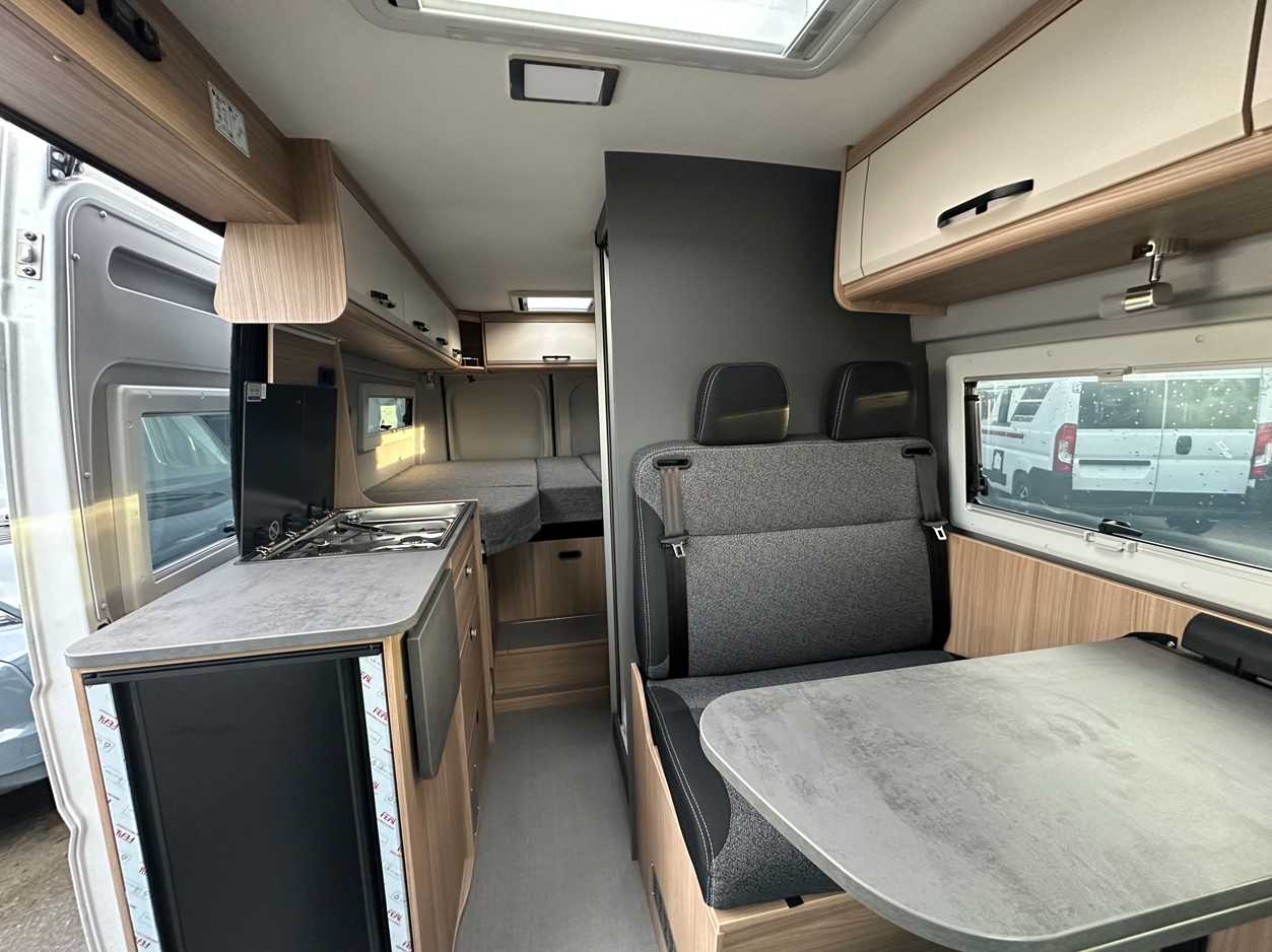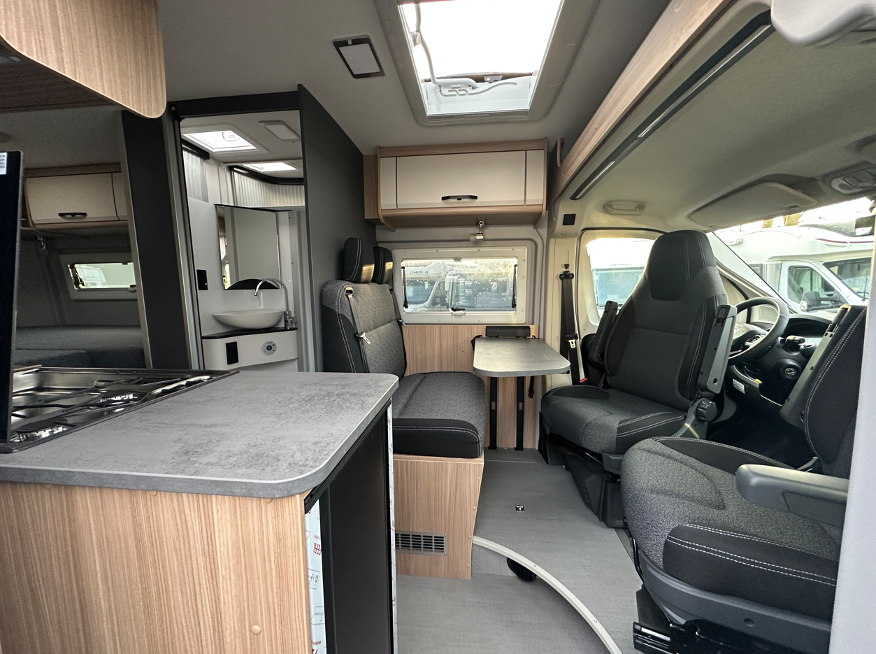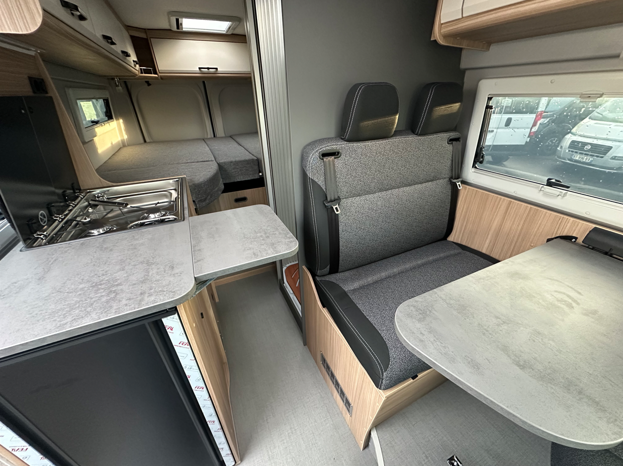 Les lits jumeaux généreux sont son point fort. Cette configuration permet d’acceder facilement dans chacun des 2 lits sans déranger l’autre tout en conservant la maniabilité et la facilité de stationnement d’un fourgon de 6 métres !