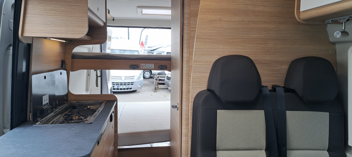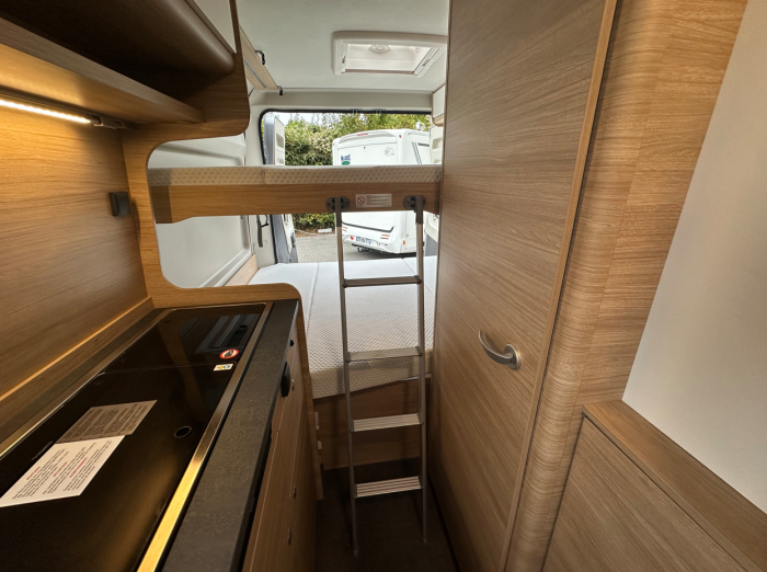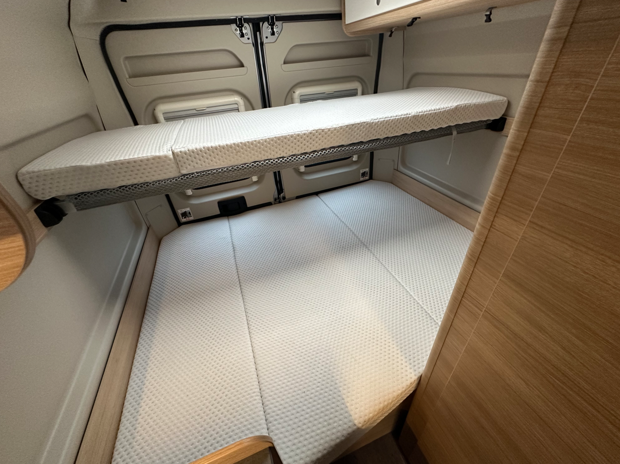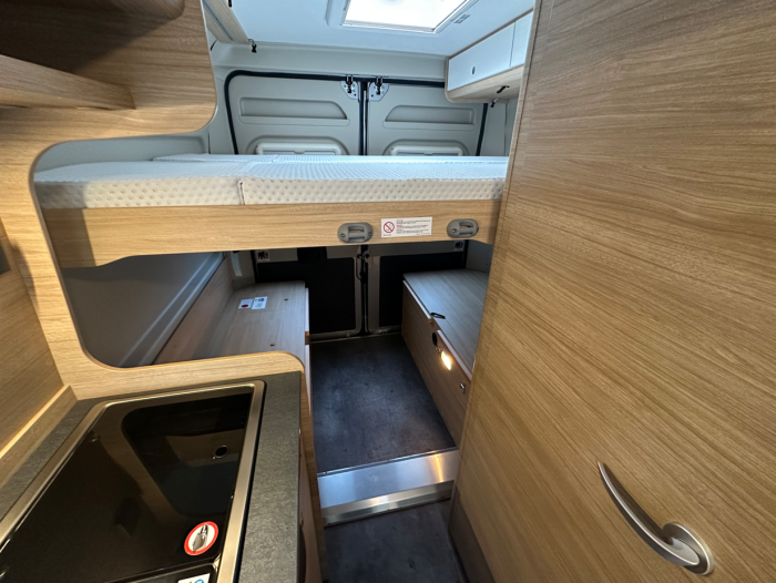 Compact sur la route et assez grand pour la famille. Avec ses quatre couchages confortables, avec 2 grands lits superposés, le R601 offre beaucoup d’espace pour des randonnées en famille. Si vous êtes moins de passagers, vous pouvez retirer le lit superposé inférieur et gagner ainsi de l’espace de rangement pour les bagages, les vélos et plus encore.